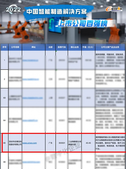 在此背景下,近日,智能制造专业研究机构e-works Research通过分析智能制造解决方案领域上市公司的市场表现、盈利情况和业务发展状况,遴选出100家业内具有代表性的上市公司,形成并发布了“2022中国智能制造解决方案上市公司百强榜”。优博讯作为工业互联网与传感器应用提供商荣登榜单,充分肯定了公司在智能制造领域的自主创新能力和核心竞争力。