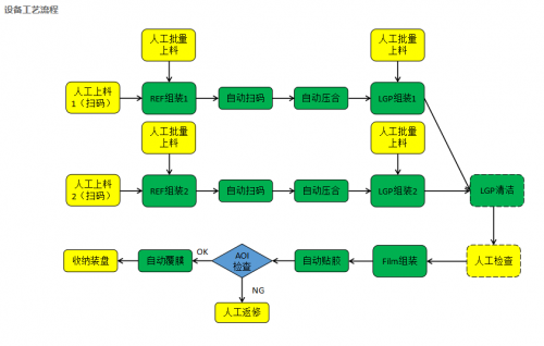 在针对在线流水作业需求设计的背光模组整线智能化解决方案,沃格集成八大工序于智能系统中,能够完成上料、组反、组导、清洁、扩散片组装、增光片组装、贴胶、AOI检测、自动覆膜等过程,不仅满足了背光模组生产环节中的不同需求,还能提高生产效率,高效地节省生产成本。