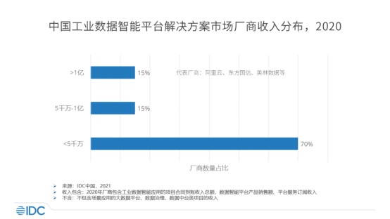 目前厂商布局大多集中在业务流程相似度高、付费能力强、数据基础好、工艺复杂的能源电力、石油石化、装备制造、钢铁、半导体等少数行业,多数厂商选择重点布局2-3个行业或场景。由于项目难度大,周期长,多数厂商年收入在5千万以下,市场格局未来变数较大。重点子市场——平台解决方案市场,2020年,市场总规模15.98亿元人民币,同比增长42.9%。