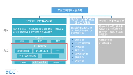 为此,IDC按客户和服务类型,将中国工业互联网平台服务商市场,梳理划分成政府侧、企业侧和产业侧三类市场。其中政府侧主要通过提供产业治理和公共服务的形式,面向省市区政府及相关机构提供区域平台、工业互联网园区等解决方案。企业侧市场主要面向工业企业,通过平台及解决方案的形式,为企业提供上云上平台以及数字化、智能化解决方案。产业侧则主要通过平台实现企业间的业务协同。