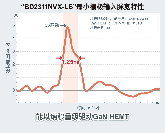 新产品实现了纳秒(ns)量级的栅极驱动速度,从而使GaN器件可实现高速开关。之所以能实现该特性,离不开ROHM对GaN器件的深入研究以及对栅极驱动器IC性能的追求。通过最小栅极输入脉宽为1.25纳秒的高速开关,助力应用产品实现小型化、进一步节能和更高性能。