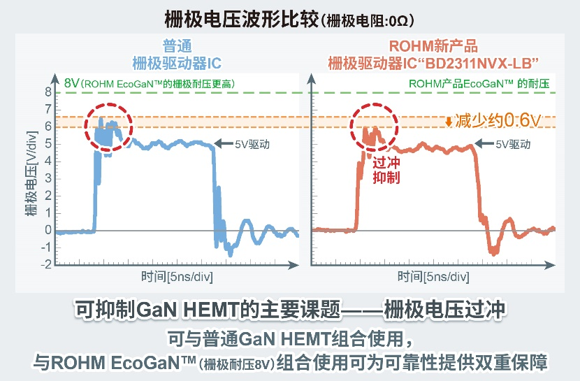 另外,新产品通过采用ROHM自有的驱动方式、搭载栅极输入波形过冲*3(一直以来的难题)抑制功能,可以防止因过电压输入而导致的GaN器件故障;通过集成ROHM的EcoGaN,还可以简化配套产品的设计,有助于提高应用产品的可靠性。不仅如此,针对多样化的应用需求,还可以通过调整栅极电阻,来选择理想的GaN器件。