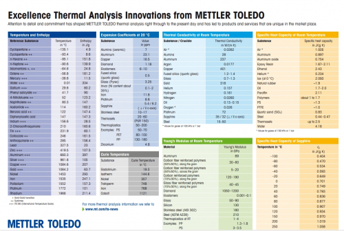 立即获取您所需的正确参考值。请下载梅特勒托利多实用的热值表,其中包含常用物质与参考材料的热值数据,如比热容、玻璃化转变温度、熔点、杨氏模量、膨胀系数以及热导率。