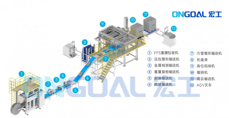 宏工科技不仅提供高性能的FFS重膜包装机,更推出了从包装、整形、金检、复称、输送、上托盘、码垛、缠绕打包到成品AGV叉车转运的一站式自动化包装解决方案。这一方案覆盖了包装生产的全过程,实现了从单机到整线的全面自动化升级,为企业提供了高效、便捷、智能化的生产体验。